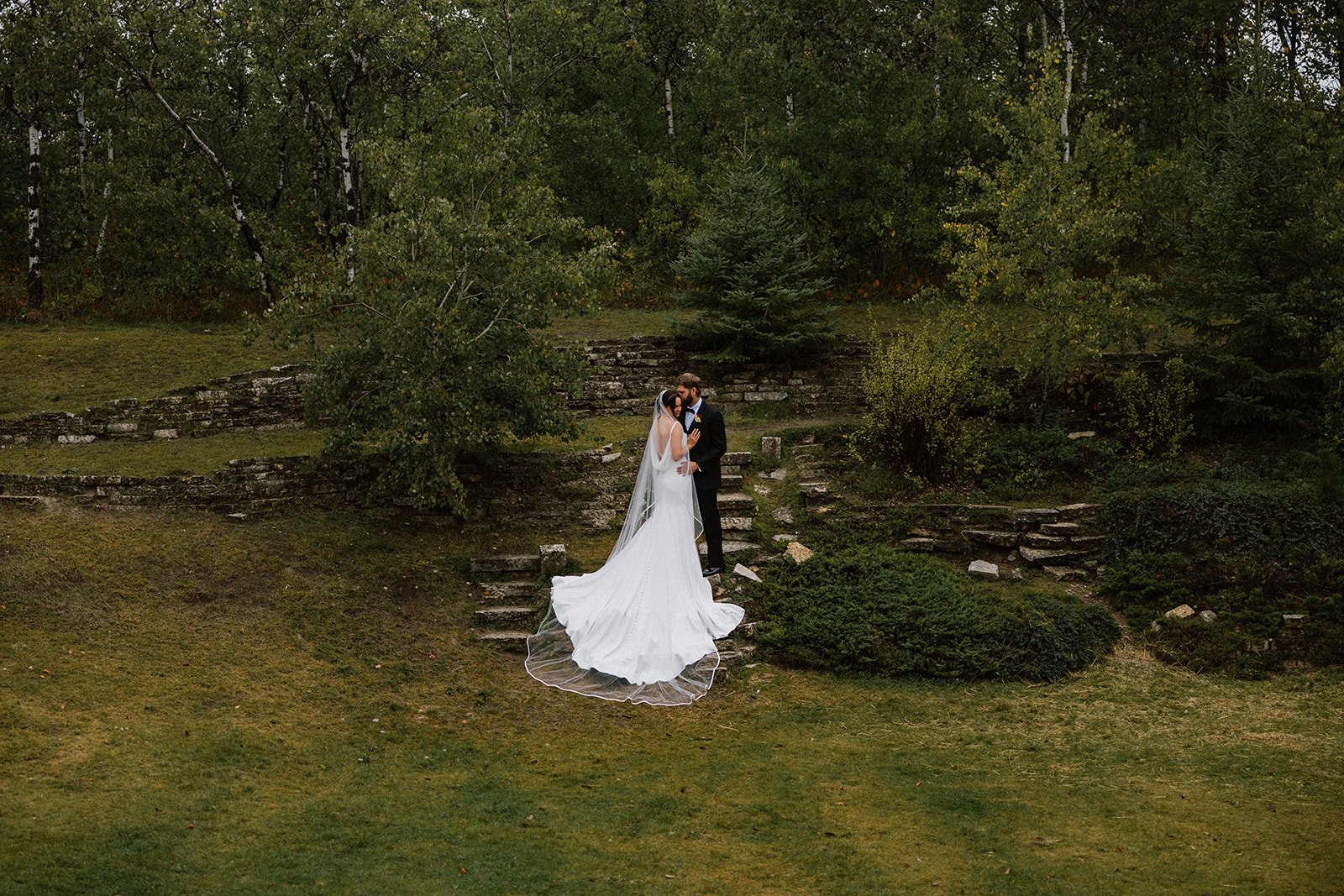 Pine Ridge Hollow sits right on the edge of Birds Hill Park, about 15 minutes from the city, and the location is a big part of what makes it special. The venue backs directly onto the park, which opens up your portrait options well beyond the property itself. Forest paths, open fields, big prairie sky. It's a lot to work with.